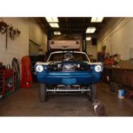 My first purchase was a set of the original type wheels for the front & rear. Locating a complete 57 Olds rear end was a bit harder. Next it had to be shortened as it was originally. My biggest decision was to admit to myself that certain things have to be left to the professionals. The chassis and all tubing was totally deteriorated beyond safety standards. So a complete new rolling chassis had to be duplicated from the original pieces. I contracted a complete reconstruction, including an original spec Hemi motor with good friend and former funny car driver himself, Bill Holtz. Bill was the owner of Holtz Custom Fabrication in Ft. Myers and along with Everett Oliver took on the challenge of reconstruction with great dedication. Bill and Everett took this project on more as a labor of love than as an income. They literally hand built a complete race car as it would have been done back in 1965. They were cautious not to use any modern day technology so that the finished car would look just as it did back in the 60’s. The new frame was constructed of chrome moly tubing just as the original with a few modifications made in the interest of safety and strength. New lexan windows were installed all around and both doors were made operable with original hinges and door handles. Operable tail lights were put in for esthetics and a set of new glass dummy head lights were set back into their sockets. A 12 volt Dyna Batt dry cell battery was tucked up in the rear between the push bar framing with a rear push/pull kill switch. The body was put on and off many times to get a proper alignment and attachment to the frame. Up front sits an original type 3 gal. Moon fuel tank with all the original type plumbing to the motor. The original aluminum aircraft bucket seat was used and re-upholstered along with new certified 5 point seat belts. The new steering wheel was made removable and a new dash pod was built housing a memory tach, boost and oil pressure gauges. To complete the rolling chassis, an original set of Hilibrand rear wheels and American Front wheels were found and powered coated. The rear 10.50 x 16 slicks with the Dental tooth ribbing were duplicated by Adams Hot Rod Rubber out of Oregon City, Oregon.